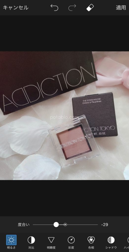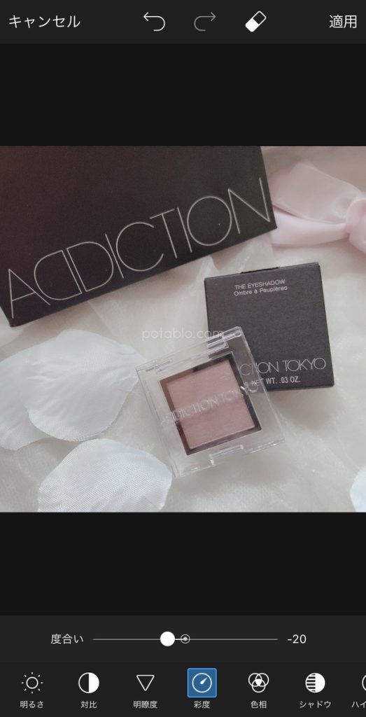 彩度を下げると画像の色が調節され落ち着いた雰囲気になります。色の強さも抑えられるので濃い色が苦手な方は普段の画像も調節してみてください。