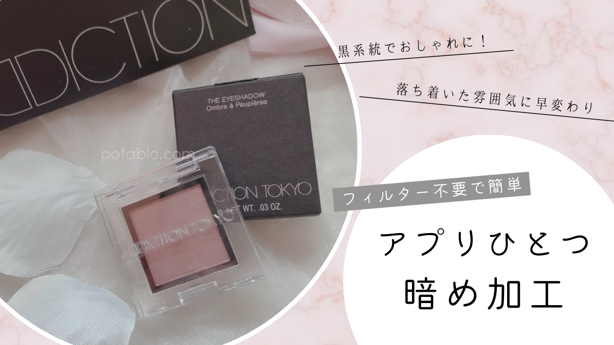 露出・彩度を下げた暗め加工。黒系統で落ち着いた雰囲気になります。特別なフィルターは使わず画像を調節するだけで簡単に作れます。